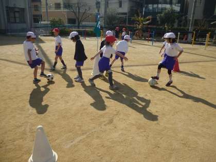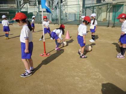 ペアになってまとあてをしました。まだ少し肌寒いですが、元気に体を動かしています。