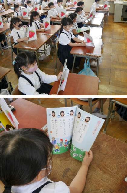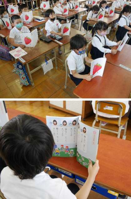 1年生が国語の教科書を音読しています。「あいうえおのうた」を読みました。「ありのこ あちこち あいうえお」・・・とがんばっています。