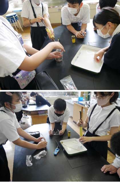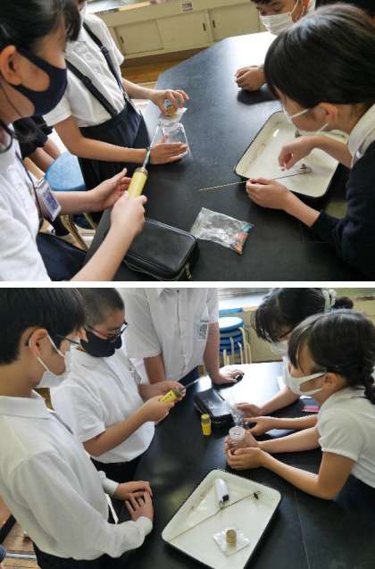 6年生が理科室で実験をしています。「ものが燃えるとき、空気中の気体にはどんな変化があるだろう」について学習しています。ろうそくで燃やす前後の空気の成分を、気体検知管でしらべています。