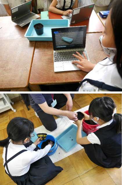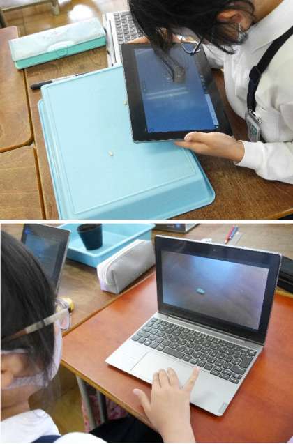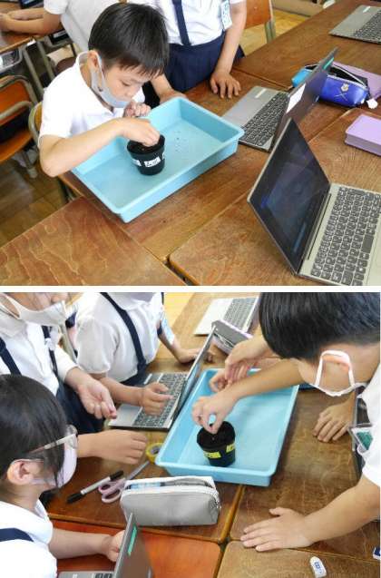 4年生では、ひょうたんの種を班ごとに植えて観察します。ひょうたんの種をタブレットで撮影して観察して、ポッドに種を植えました。