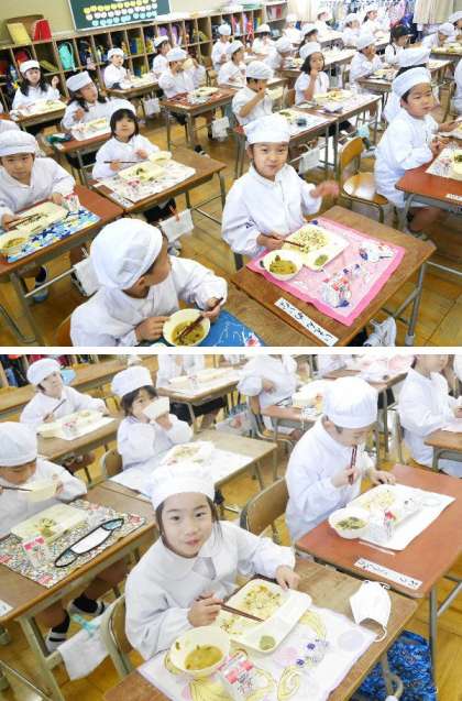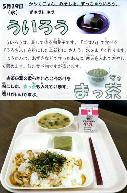 今日の献立は、かやくごはん、みそしる、まっちゃういろう、牛乳でした。ういろうが甘くておいしいです。