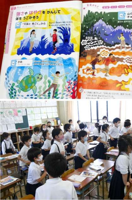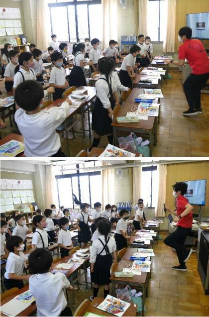 2年生の音楽の時間です。「天国と地獄」の曲を聞いて、強さや速さを感じて体を動かして表現しています。とっても楽しそうに体を動かしていました。