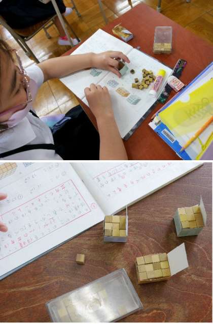4年生の算数です。立体のかさの比べ方を学習しています。小さな木片1立方センチを並べています。こうすると比べることができるんですね。