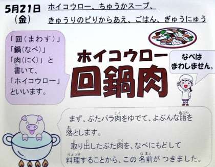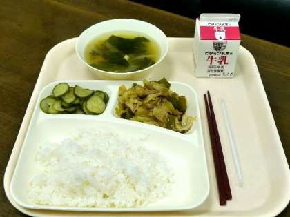 今日の献立は、ホイコウロー、中華スープ、きゅうりのピリからあえ、ごはん、牛乳でした。