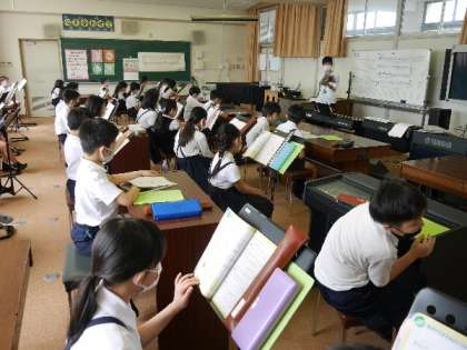 4年生が音楽室で授業です。歌声とリズムのトレーニングで、早口を練習していました。