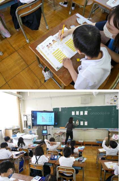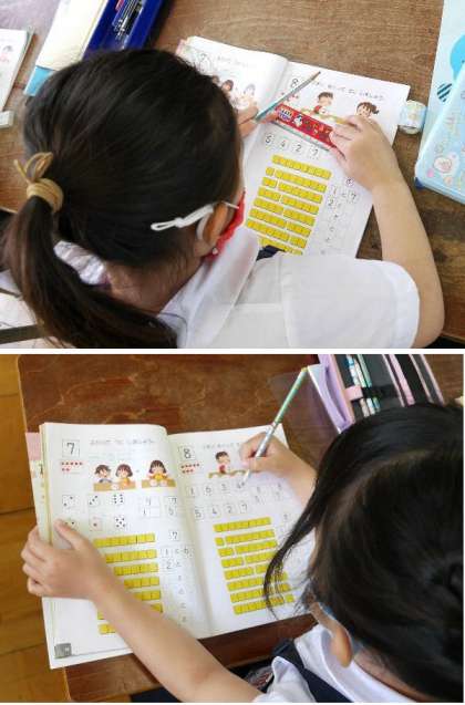 1年生の算数では、数字を分けて考えられるように、「ふたりで7にしよう」「2まいで8にしよう」と、数の組み合わせを学習しています。これから、大きな数の足し算やひき算するときに、さっと計算できるために必要なことですね。しっかり身につけましょう。