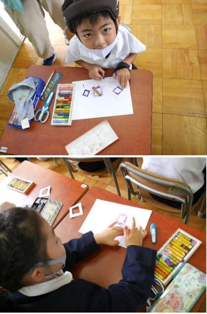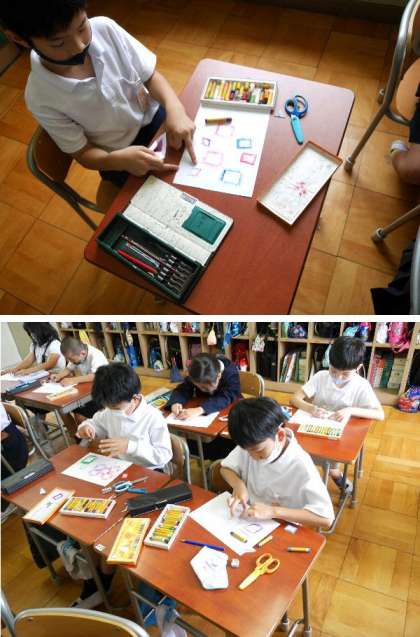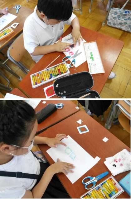 2年生が、四角くきった厚紙にクレヨンをぬっています。いくつも重ねるとアジサイのお花になります。いろんな色をつかってきれいです。