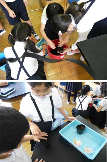 5年生の理科では、インゲンとへちまの種を播種させて、ポットに定植しています。