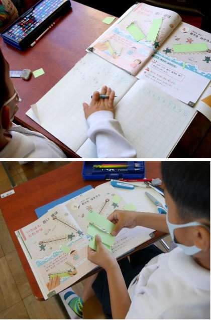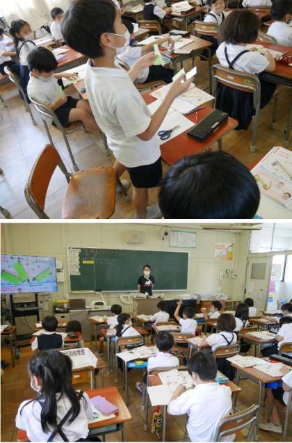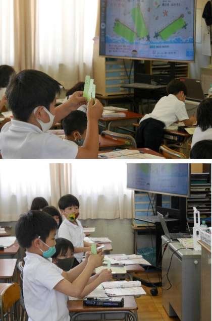 2年生の算数では、長さを比べるため、3枚のちがう長さの紙を用意して、どこに注意してくらべたらいいか調べています。いちばん長い線はどれかな。はしをそろえて調べるとよくわかるよね。見た目だけではわからないこともありますね。