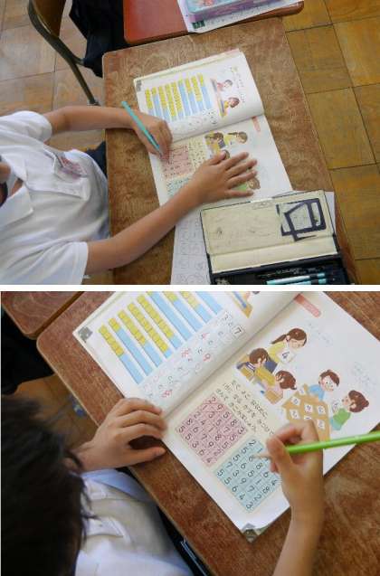 1年生が、算数の教科書の数字のマスから2つ選んで10を作っています。これからの学習で、くりあがったり、ひき算での学習で、何と何で10になるが、すばやく計算できることが、とても大切なんですね。