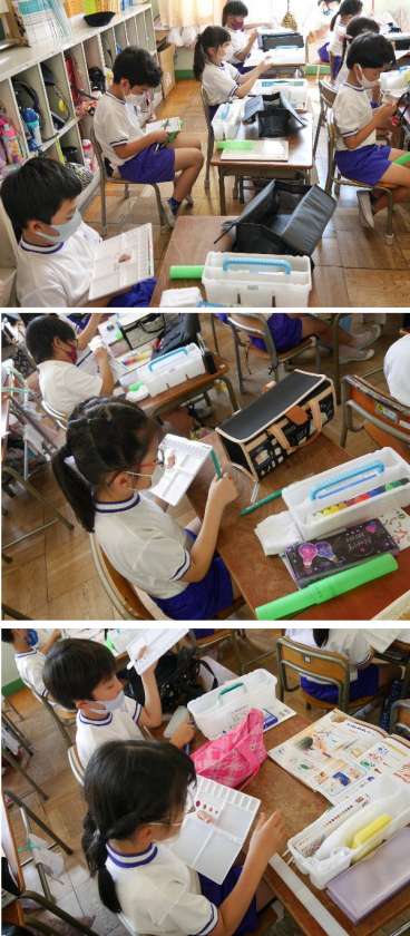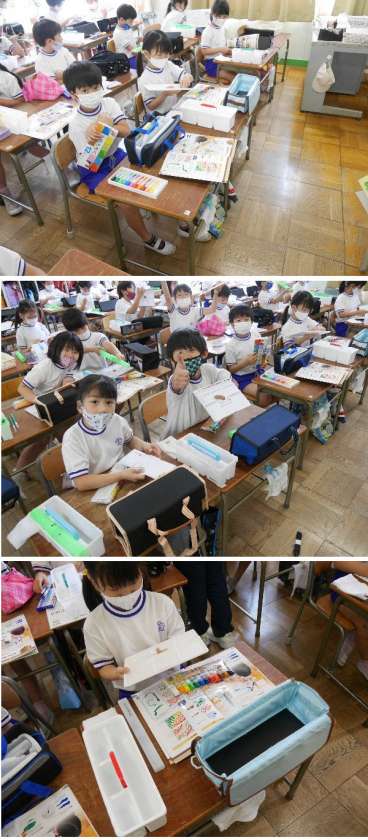 3年生では、水彩絵の具のセットを購入いただき、学校ではじめて、かばんの中身を確認しました。絵を描くためのいろいろな道具が入っています。今日は、そくな道具を出してみて確認しました。