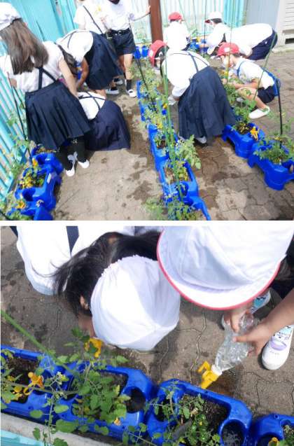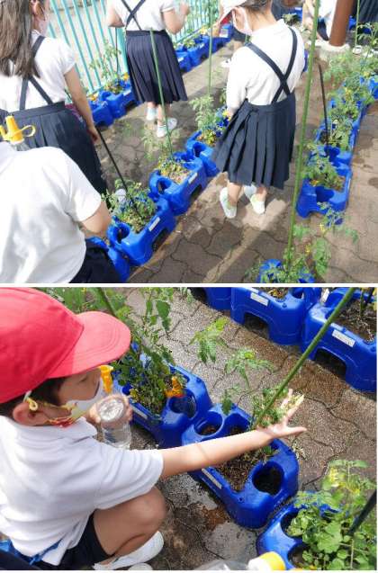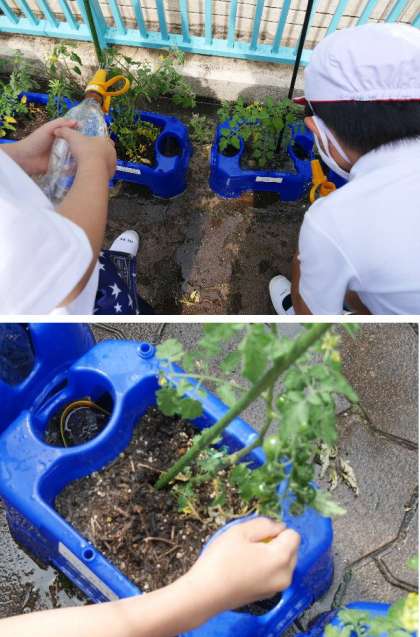 2年生が、ミニトマトに水やりをしています。もう、青いですが、ミニトマトが実っています。赤くなるのが楽しみですね。