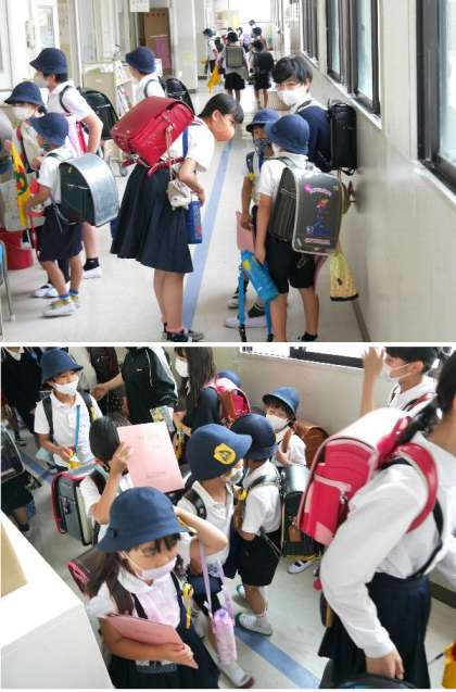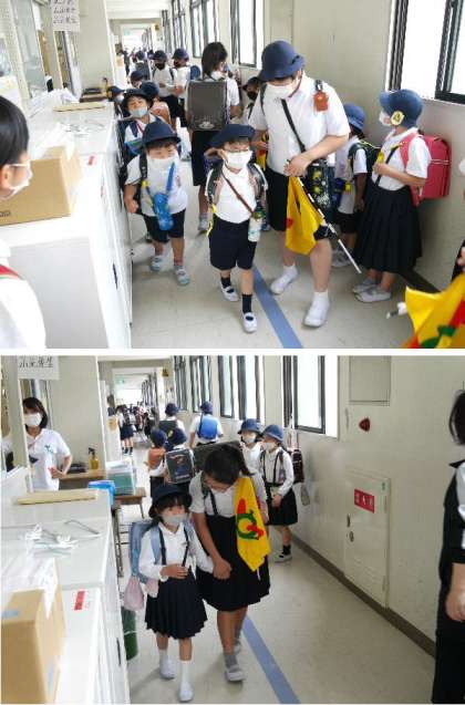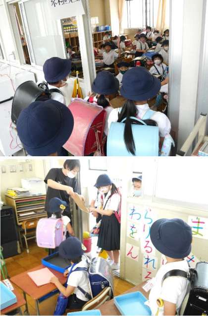 今日は、毎日の集団登校の分団が集まって、集団登校の集合時間や集合場所など確認をしました。6年生の代表児童が、1年生の教室まで迎えにきてくれました。