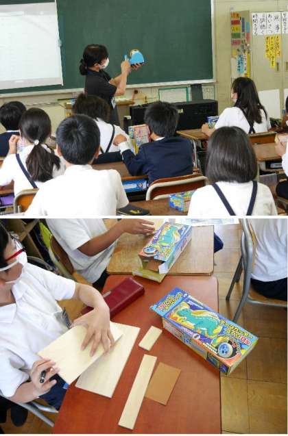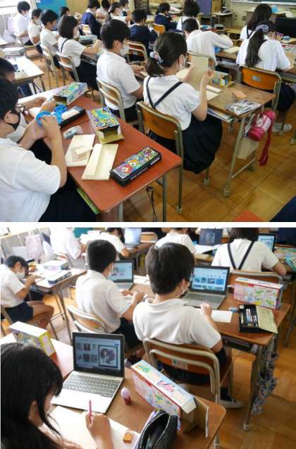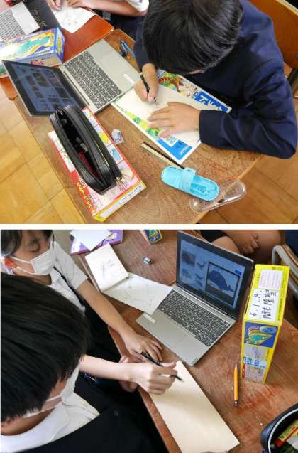 6年生が、テープカッターを図工でつくっていくきます。側面のデザインを考えて、板に描いていきます。