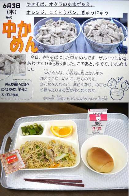 今日の献立は、やきそば、オクラのあまずあえ、オレンジ、黒糖パン、牛乳でした。