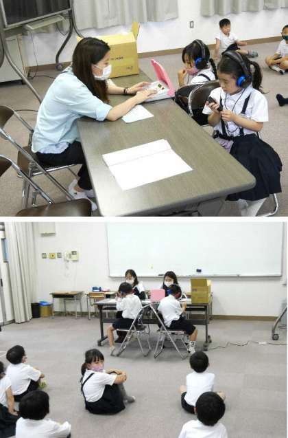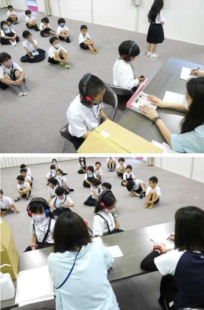 1年生が聴力検査をしています。保健室の先生が機械を使って、ヘッドフォンからいろんな音が聞こえるか検査しています。