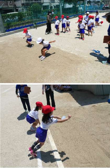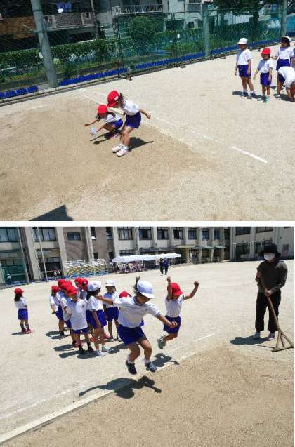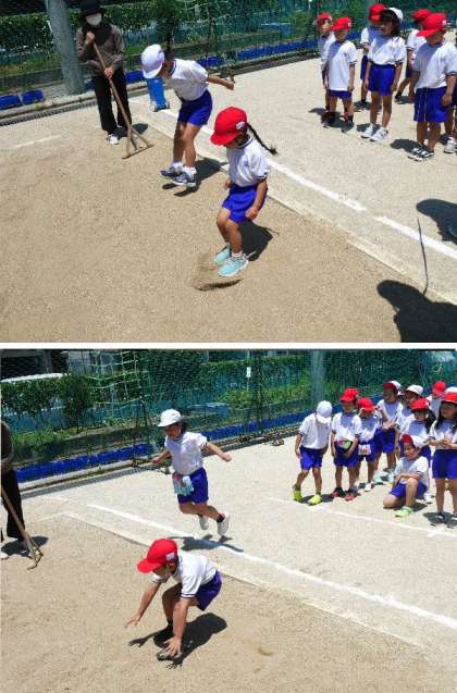1年生が砂場ではばとびの測定をしていました。いきおいをつけて、どけだけとべるかな。