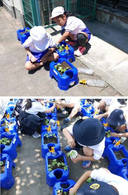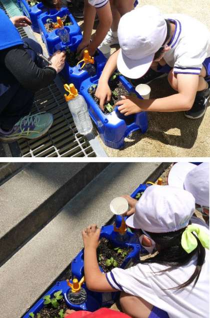1年生のあさがおの鉢には、たくさん種を植えたので、たくさんの双葉がでています。いい双葉だけ残して、いらない葉はつんでしまいます。