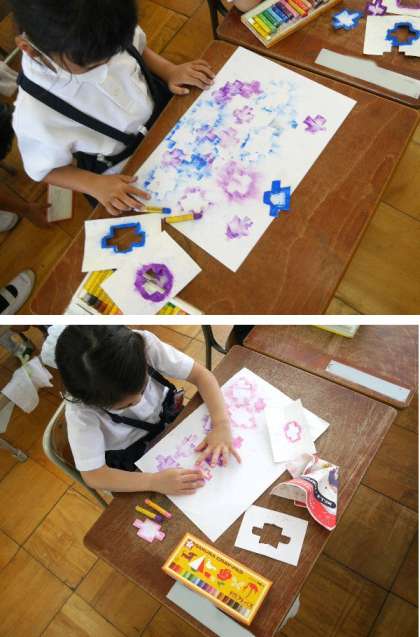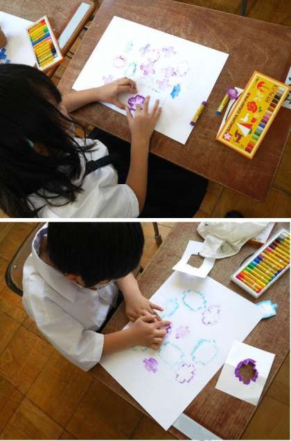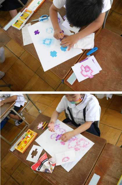 1年生が、型紙を画用紙で作って、そこにクレヨンでいろを塗り、同じ形を重ねていきます。きれいなアジサイの花ができあがってきました。