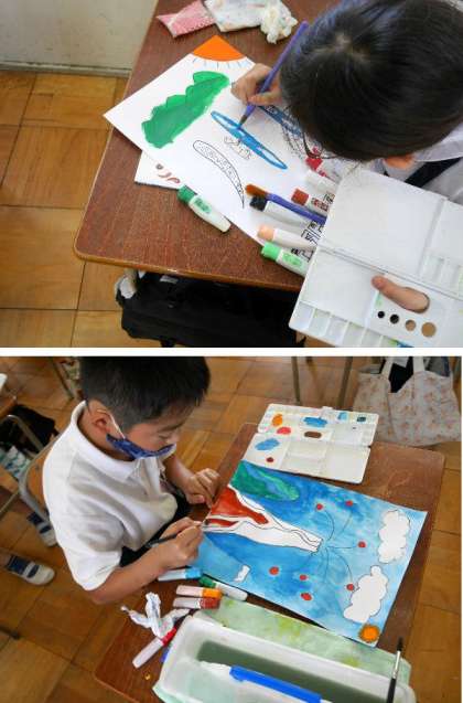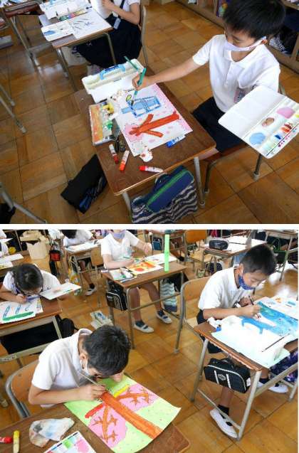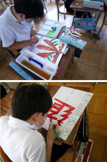 4年生が、漢字をデザインしたものに着色して仕上げています。なんという漢字かな。「山」「道」「木」・・・いろんな漢字がデザインされています。