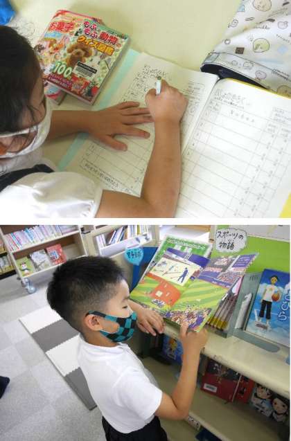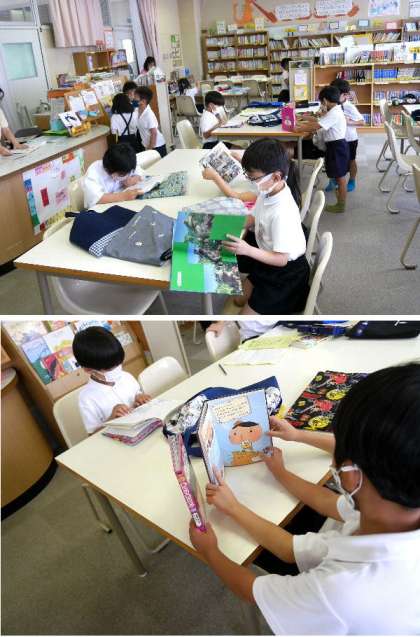 1年生が図書室で本を読んだり借りています。読んだ本は「読書記録」をつけていきます。1年間で何冊の本が読めるかな!