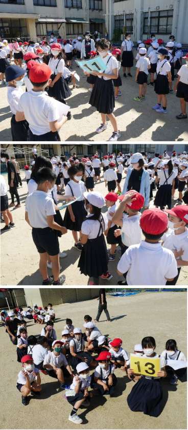 1年生〜6年生の異学年交流をする縦割り班の顔合わせを、運動場でおこないました。6年生のリーダーさんがカードをもって、メンバーをチェックしています。