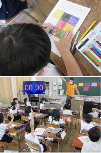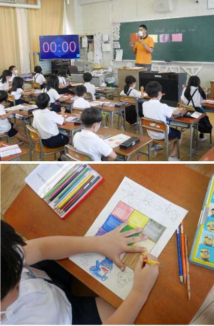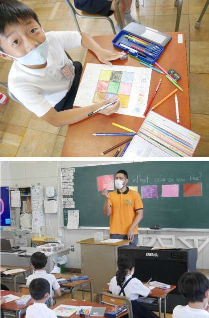 2年生の英語には、ネイティブのクリス先生がきてくれました。What color do you like? と、何の色が好きかで、自分で作った色のマス目をチェックしてビンゴします。