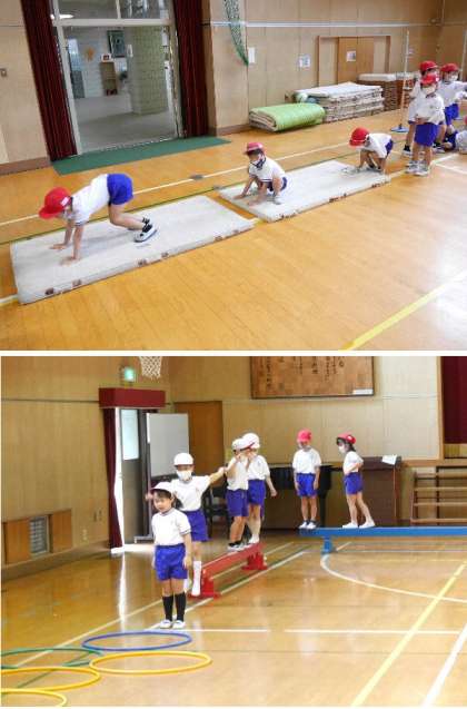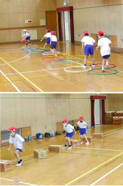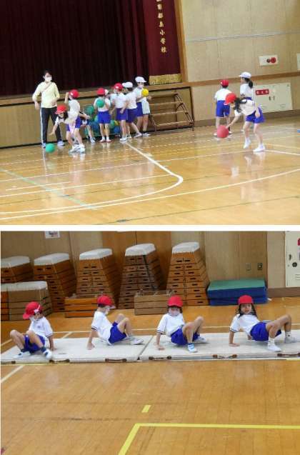 1年生の体育では、からだのいろいろな使い方を、いろいろな運動をしながら練習しています。