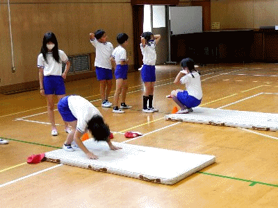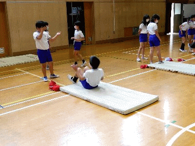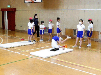 4年生が体育館でマット運動をしています。前転と後転をしっかり練習しています。
