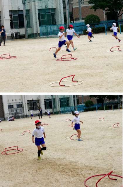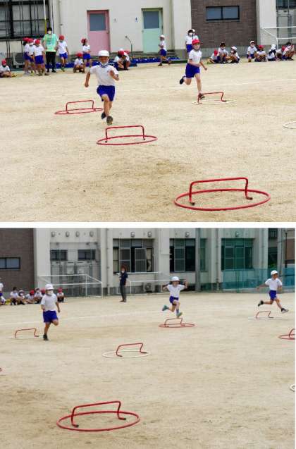 3年生が、ハードルをとびこえて走る練習です。まずは、低いところから練習。
