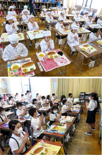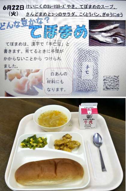 器用の献立は、鶏肉のカレーマヨネーズ焼き、てぼまめのスープ、サンド豆とコーンのサラダ、黒糖パン、牛乳でした。