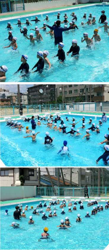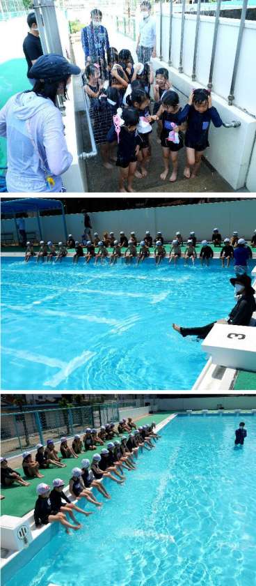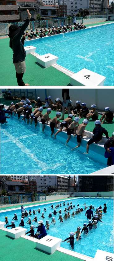 1年生の初めてのプールの日です。シャワーをあひたり、プールに入るのに、大さわぎの1年生でした。はじめての体験にびっくりしたり、興奮して、大きな歓声が続きました。今日は、プールに入る練習だけで終わってしまいました。先生の合図をしっかり見てスムーズに練習できるようにがんばりましょう。