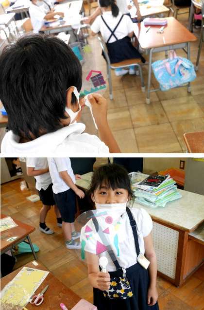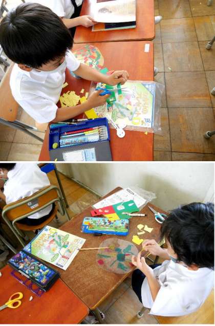 2年生が工作をしています。透明なうちわに、いろいろな色をはりつけてデザインしています。太陽の光にかざすと、いろいろな色の光があらわれますよ。