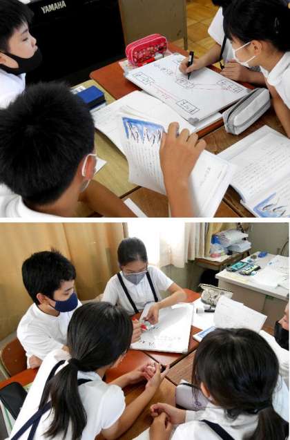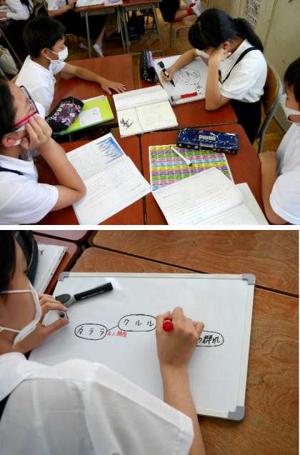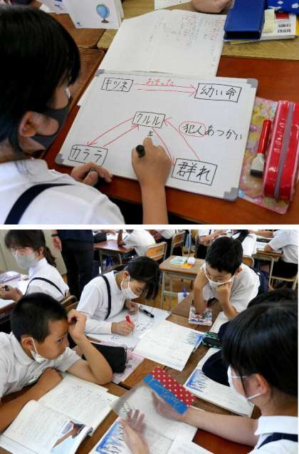 6年生が、国語の教科書の「風切るつばさ」の登場人物を書き出して、関係図を作って整理していました。