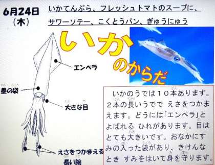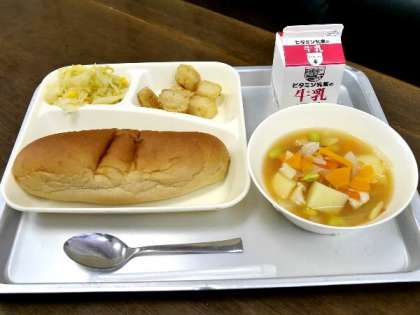 今日の献立は、いかてんぷら、フレッシュトマトのスープ煮、サワーソテー、黒糖パン、牛乳でした。
