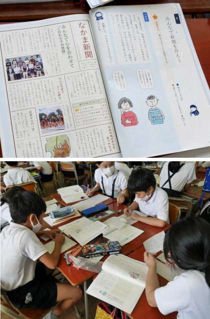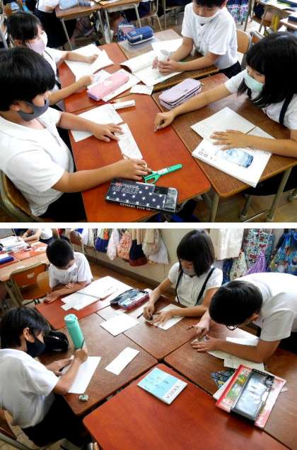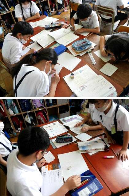4年生の国語では、班ごとに新聞を作っています。記事を書いて、読み合わせて、訂正して、原稿に清書していきます。