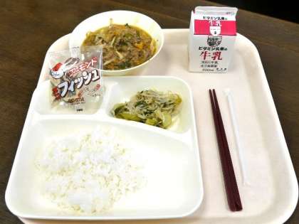 今日の献立は、マーボーはるさめ、チンゲンサイともやしの甘酢和え、アーモンドフィッシュ、ごはん、牛乳でした。