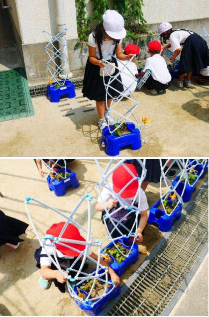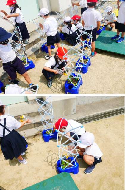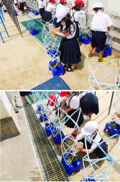 1年生が毎日おせわをしているあさがおも大きくなってきました。支柱をつけて、たっぷり水やりをしました。