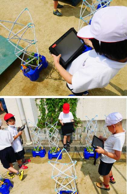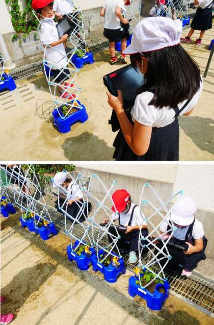 1年生が、使い方をおぼえたばかりのタブレットで、あさがおの写真を撮りました。観察記録としてしっかり撮影しました。