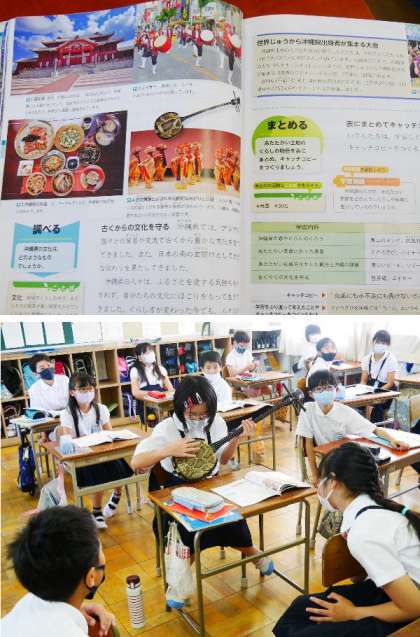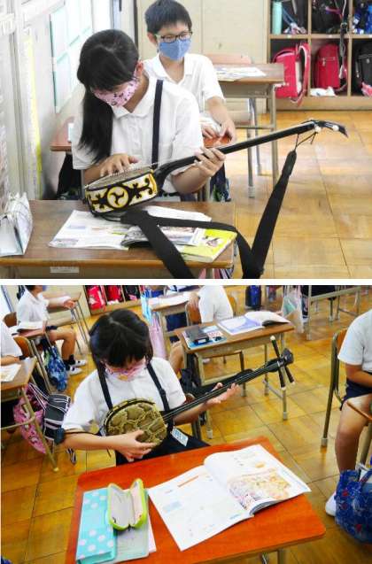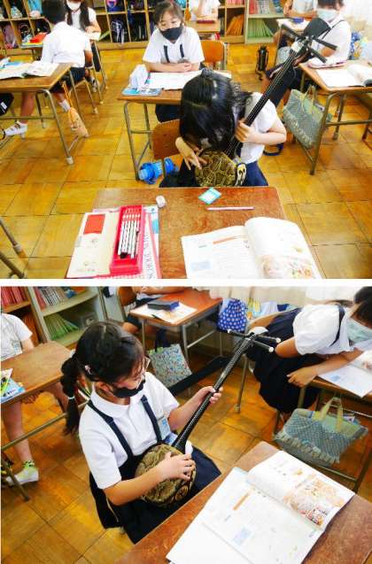 5年生の社会では沖縄の文化について学習しています。本物の三線を披露して手にとって体験しました。