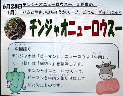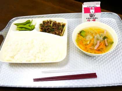 今日の献立は、チンジャオニューロウスー、えだまめ、ハムと野菜の中華スープ、ごはん、牛乳でした。