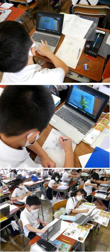 3年生が、理科の授業で育てたホウセンカを観察しています。1人1台学習端末のパソコンで写真をとって、それを拡大して観察して記録していました。観察に混雑することなくスムーズにすすめられていました。子どもたちもパソコンの扱いに慣れていますね。