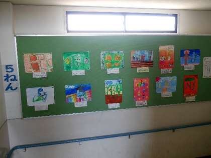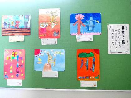 5年生の掲示板には、自分の名前の漢字一文字をデザインした絵が掲示されました。カラフルできれいに仕上がっていますね。