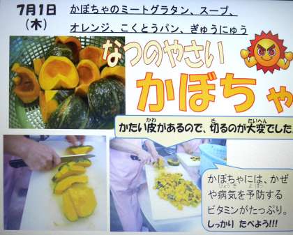 今日の献立は、かぼちゃのミートグラタン、スープ、オレンジ、黒糖パン、牛乳でした。かぼちゃがおいしいですね。