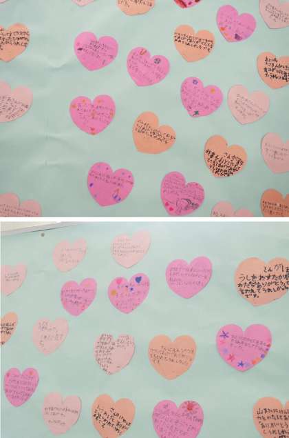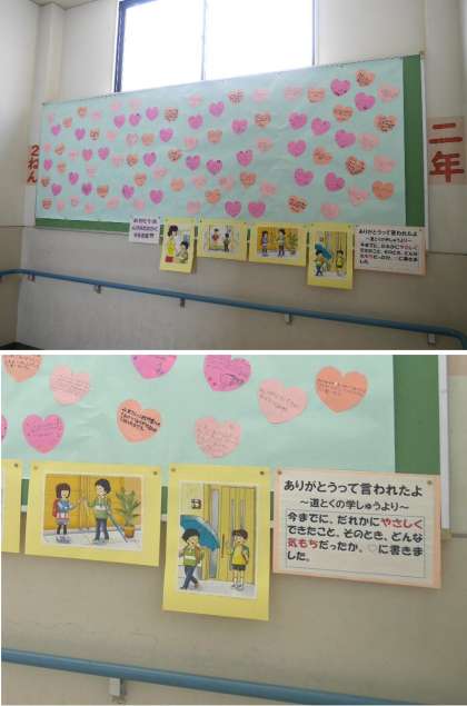 2年生の道徳で、「ありがとう」について考えました。今までだれかにやさしくできたことやその気持ちをハート用紙に書きました。