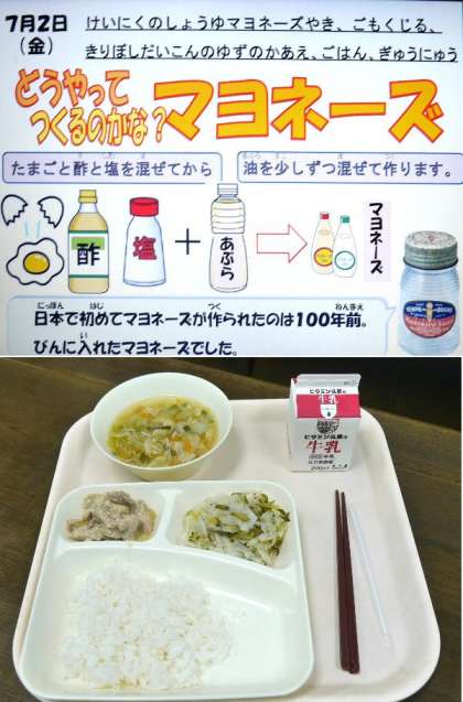 今日の献立は、鶏肉のしょうゆマヨネーズ焼き、五目汁、切り出し大根の柚香あえ、ごはん、牛乳でした。