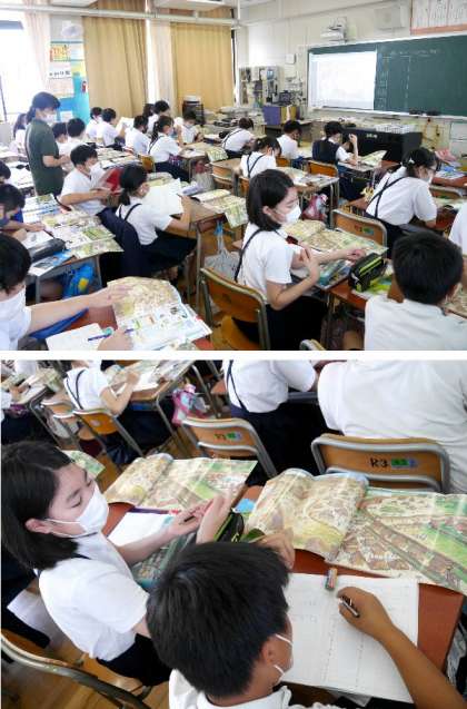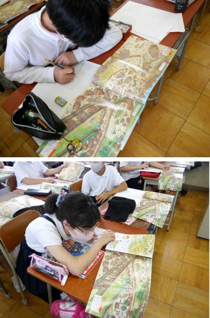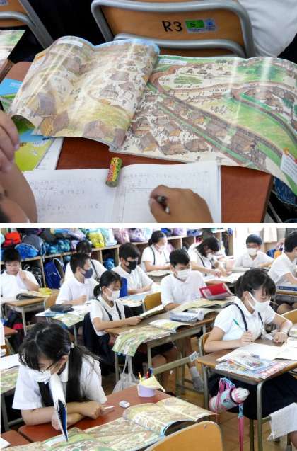 6年生が社会の教科書のイラストを見ています。縄文時代と弥生時代の違いなど、イラストをみて探しています。
