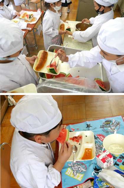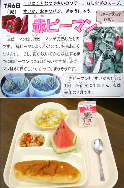 今日の献立は、鶏肉と夏野菜のソテー、おし麦のスープ、スイカ、おさつパン、牛乳でした。スイカがでてきました。もう夏ですね。