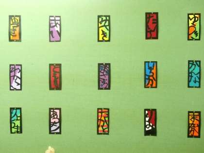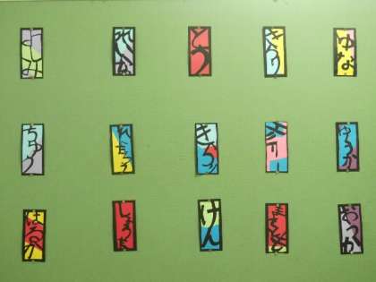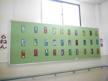 6年生の掲示板に切り絵が掲示されています。なまえを切り絵にしています。いいかんじです。