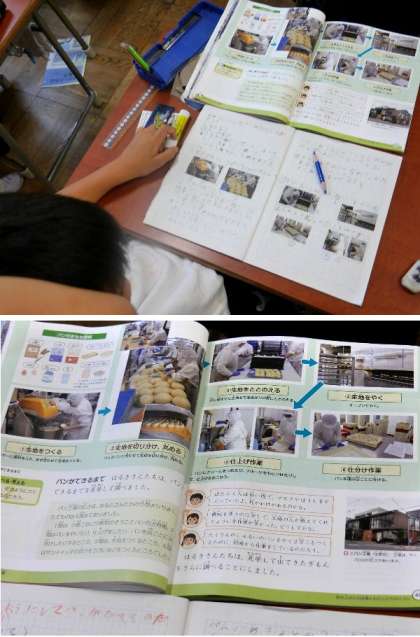 3年の社会です。工場でパンをどのようにつくっているのか、はたらく人の様子などを学習しています。